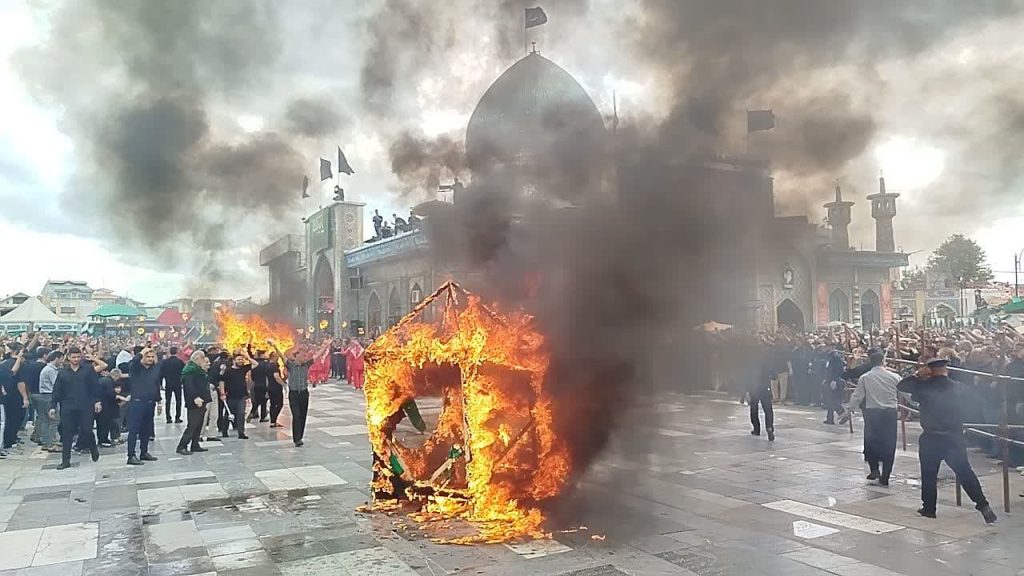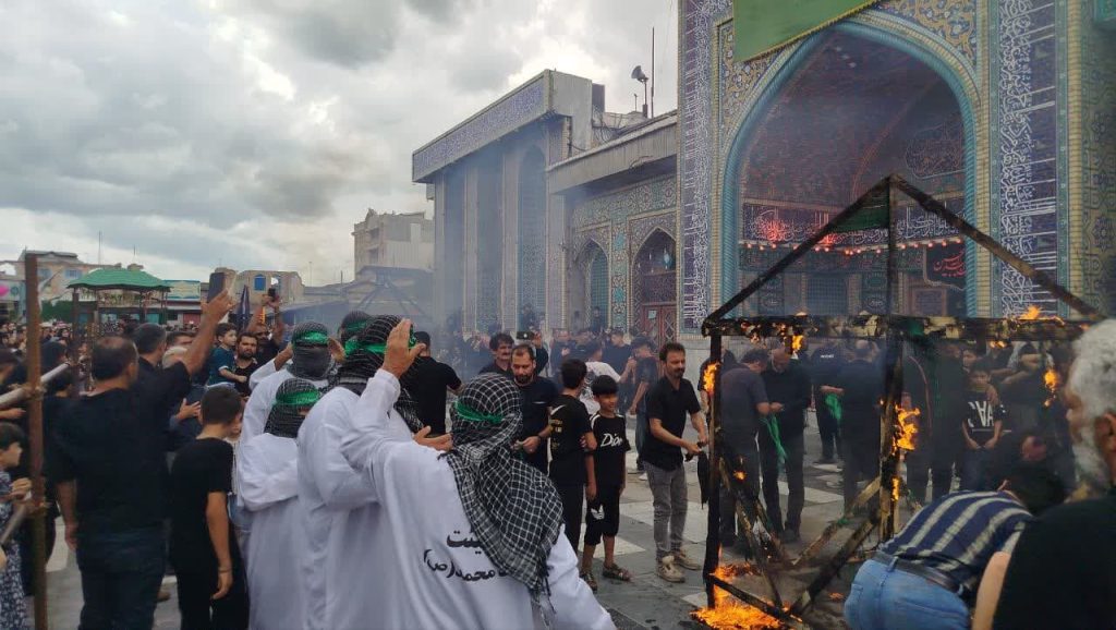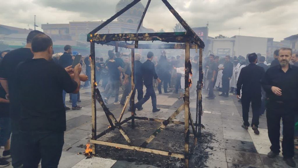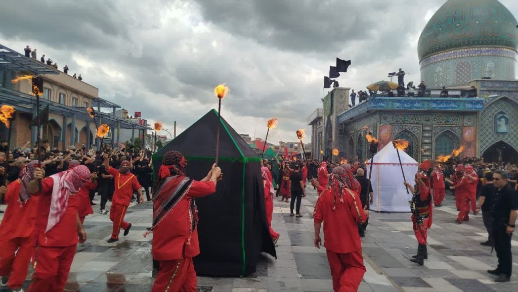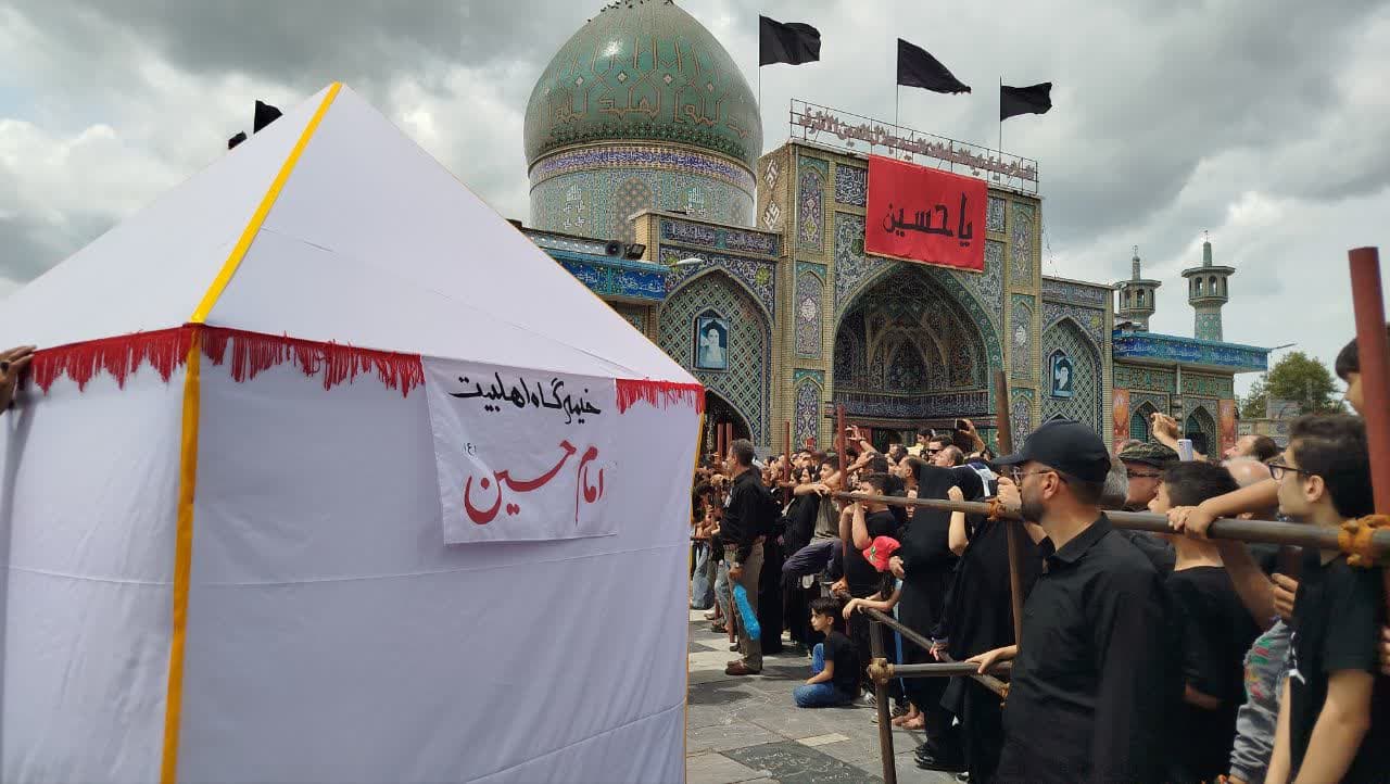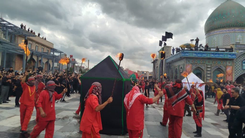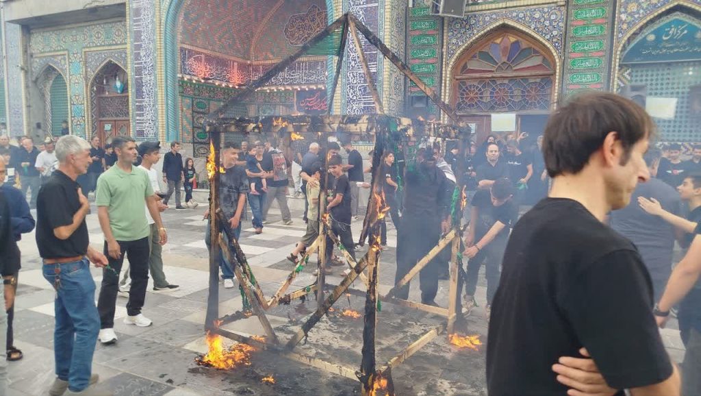 در صحن حرم پس از قرار گرفتن خیمه اهل بیت و خیمه امام حسین در ابتدای صحن ، اطفال اهل بیت در خیام قرار می گیرند و پس از اجرای یک گوشه از آئین نمایشی تعزیه که بنا به روایت هرساله از وقایع کربلا به تصویر کشیده می شود ، تعدادی از یتیمان اهل بیت به شهادت و با دستور عمر سعد و شمر خیام به اتش کشیده می شود و این در حالی است که در طی مراسم صدای دهل و شیپور جنگی نواخته می شود و پس از سوختن خیام گروه عزادار با سینه زدن و دست به سر کوبیدن ندای وای حسین کشته شد دو دور حرم مطهر را طواف می کنند و بدین صورت این آئین نمایشی به اتمام می رسد.