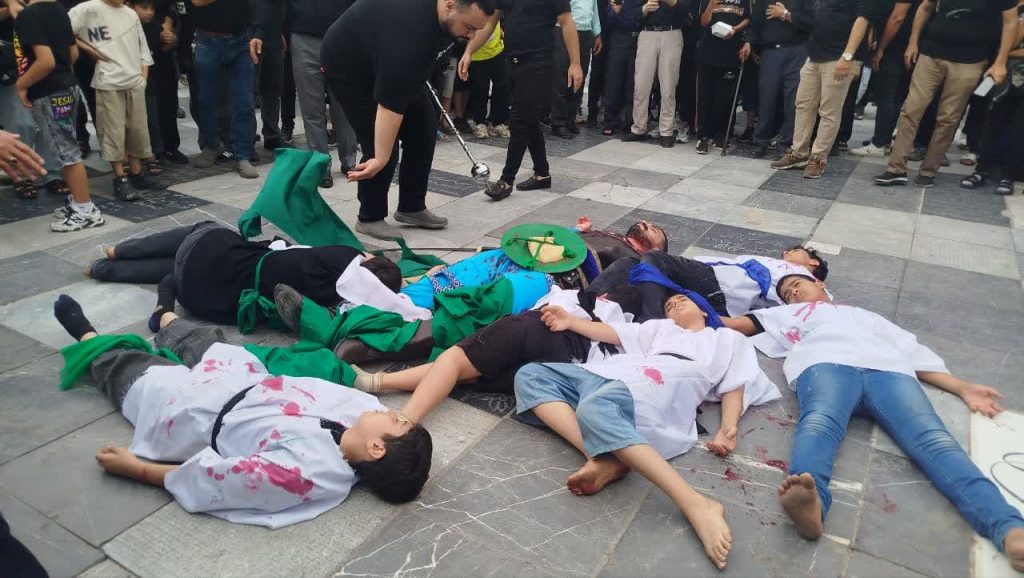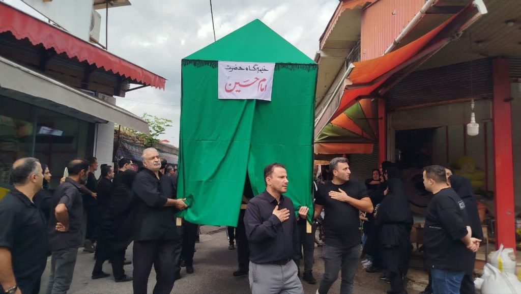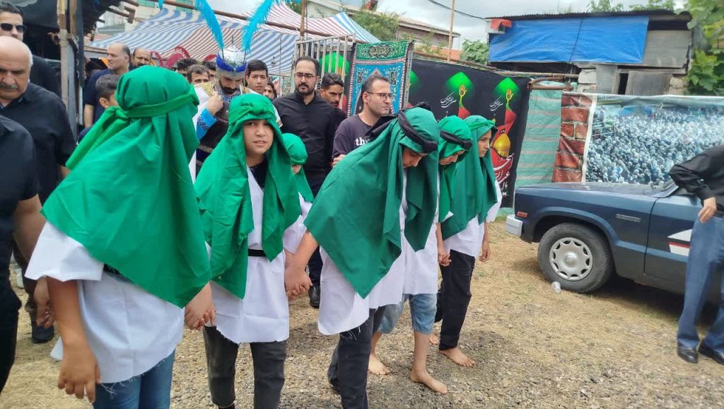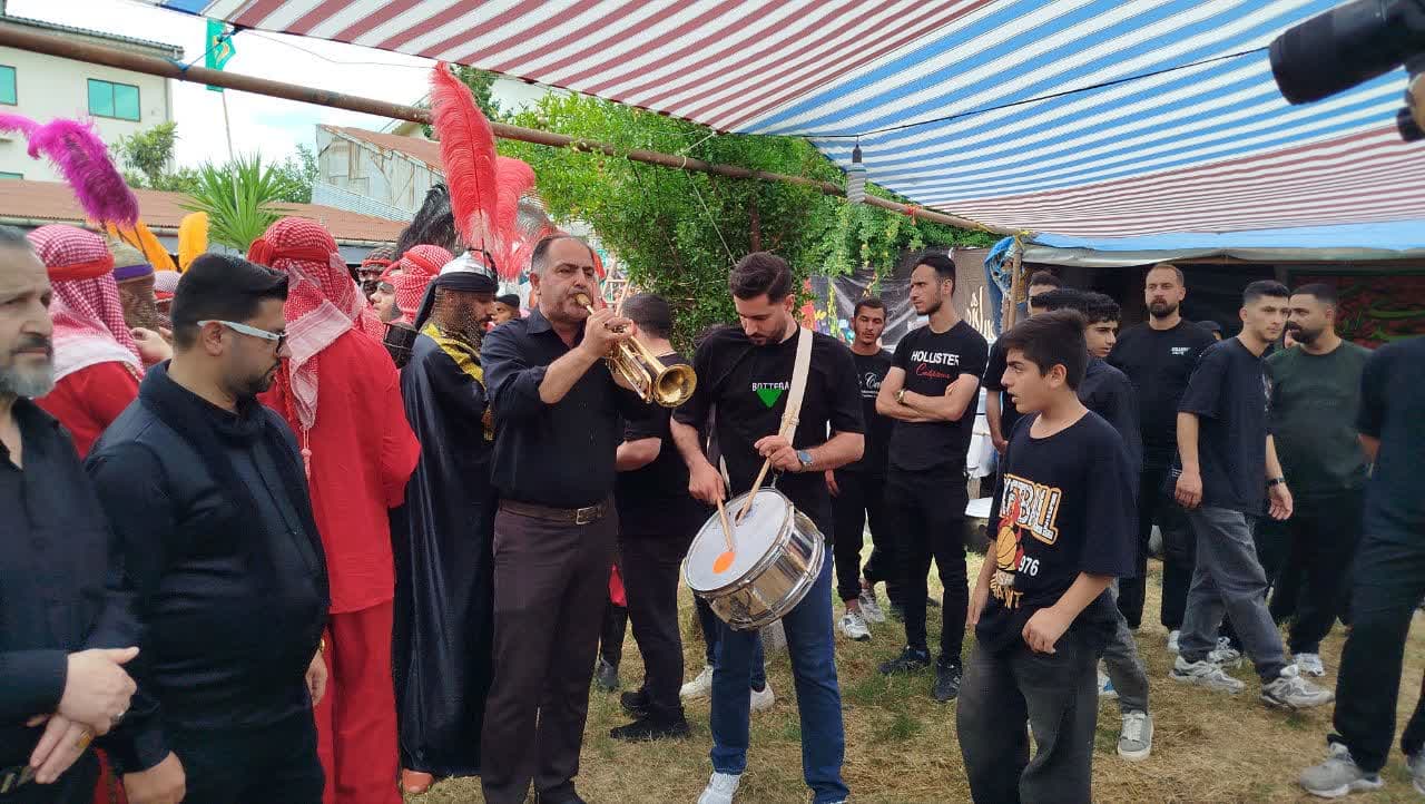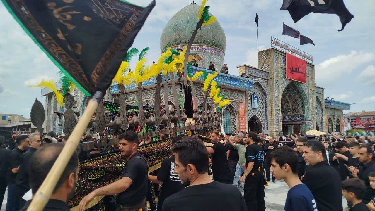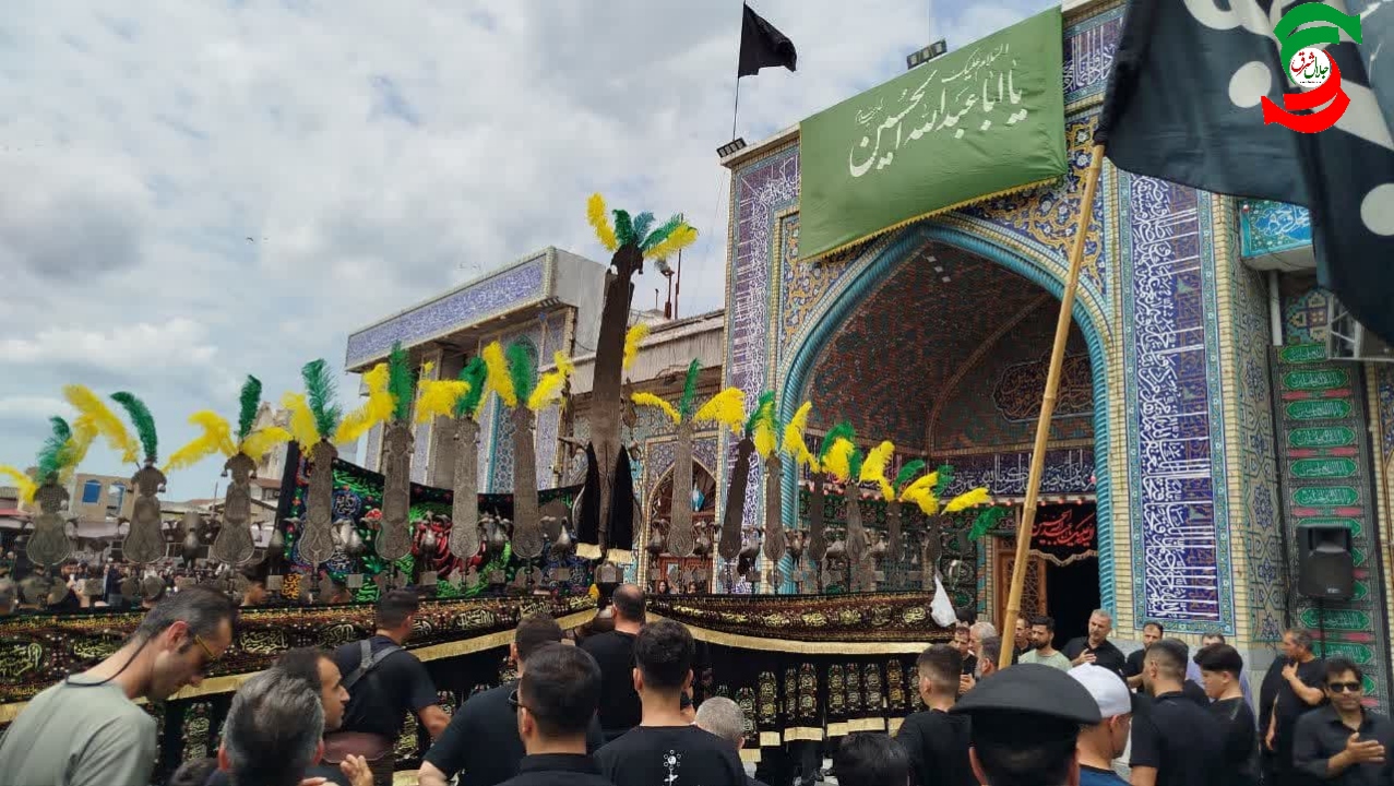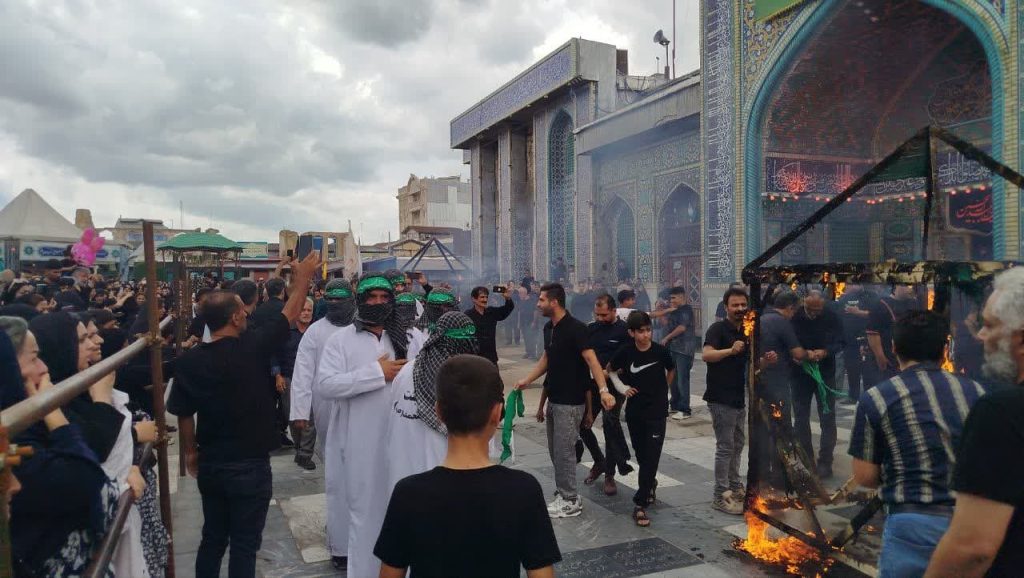 در صحن حرم پس از قرار گرفتن خیمه اهل بیت و خیمه امام حسین در ابتدای صحن ، اطفال اهل بیت در خیام قرار می گیرند و پس از اجرای یک گوشه از آئین نمایشی تعزیه که بنا به روایت هرساله از وقایع کربلا به تصویر کشیده می شود ، تعدادی از یتیمان اهل بیت به شهادت و با دستور عمر سعد و شمر خیام به اتش کشیده می شود و این در حالی است که در طی مراسم صدای دهل و شیپور جنگی نواخته می شود و پس از سوختن خیام گروه عزادار با سینه زدن و دست به سر کوبیدن ندای وای حسین کشته شد دو دور حرم مطهر را طواف می کنند و بدین صورت این آئین نمایشی به اتمام می رسد.