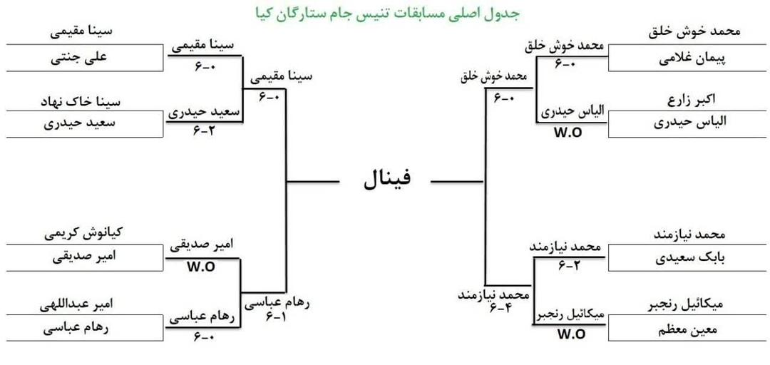 فینال مسابقات « جام ستارگان تنیس کیا» عصر امروز برگزارشد و سینا مقیمی رنکینگ ۲ تنیس ایران ۶بر۴ بر محمد خوش خلق رنکینگ ۱۰ ایران غلبه کرد و قهرمان نخستین دوره مسابقات «جام ستارگان تنیس کیا» در شهرستان آستانه اشرفیه شد.