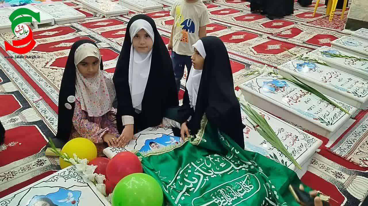 بادکنکها باد شدند، روبانها بسته شد، و میز تولد با دستان مادران چیده شد. فضای مزار با عطر گل، صدای خنده کودکانه، و اشکهای پنهان، رنگی تازه گرفت.