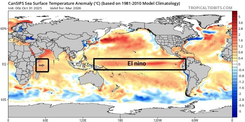 برخی کارشناسان هواشناسی از روئیت پدیده ال نینو و دو قطبی مثبت Iod اقیانوس هند از اواخر زمستان طبق سرویس Cansips خبر میدهند.