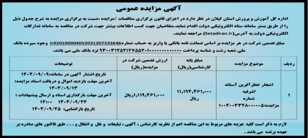 آگهی مزایده عمومی اشجار خطر آفرین مدارس آستانه اشرفیه