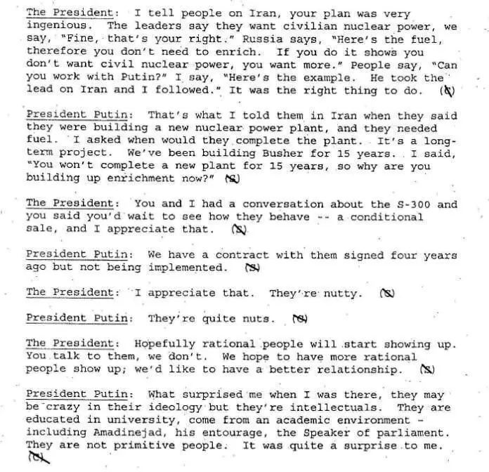 به گزارش جلال شرق به نقل از انتخاب آنلاین، در بخشی از اسنادی که اخیرا آرشیو امنیت ملی آمریکا منتشر کرده، ولادیمیر پوتین در گفت وگویی با جورج بوش رییس جمهور وقت آمریکا که در سال ۲۰۰۵ انجام شد، با اشاره به گفت و گوی یک ساعت و ۲۰ دقیقهای خود با ریس جمهور ایران گفته است: به او گفتم اگر مذاکرات را ادامه ندهد، کشورش را به گوشهای خواهد راند و آن را منزوی خواهد کرد. چگونه میخواهد از آن بیرون بیاید؟