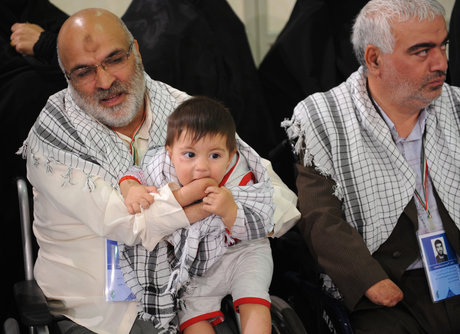 کمکم خانوادههای جانبازها از آنطرف حسینیه میآیند و پشت سر جانبازشان میایستند. بعضیها یکی دو نفر هستند و بعضیهم به حرف مسئولان بنیاد شهید گوش نکردهاند و بجای حداکثر دو تا همراه، با چهار پنج نفر آمدهاند. یکی از جانبازها نوزاد کوچکی را در بغل گرفته و عکاسها دارند عکس میگیرند. فکر میکنیم نوهاش باشد اما فیلمبرداری به حسین عکاس میگوید: حسین! فکر نکنی نوهشه ها، پسرشه!