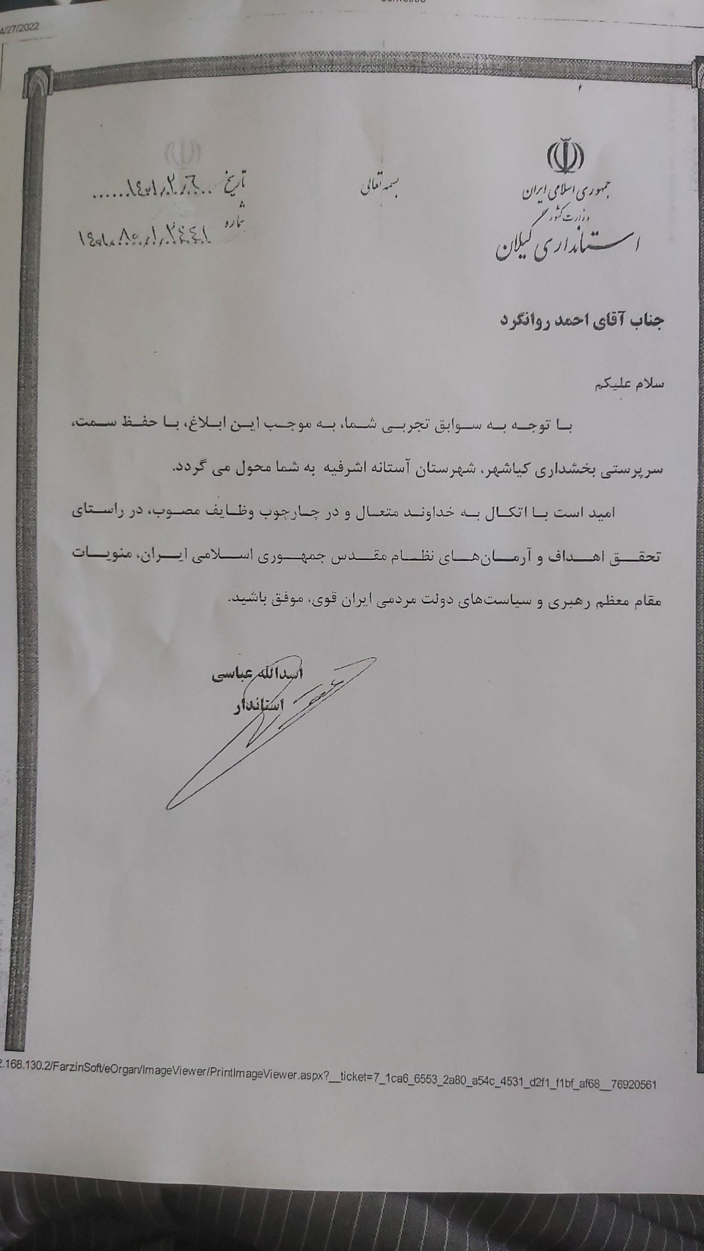 به گزارش پایگاه اطلاعرسانی جلال شرق، در حکم صادره از سوی اسدالله عباسی آمده است،با توجه به سوابق تجربی شما به موجب این حکم با حفظ سمت به سمت سرپرست بخشداری بندر کیاشهر شهرستان آستانهاشرفیه منصوب می شوید.
