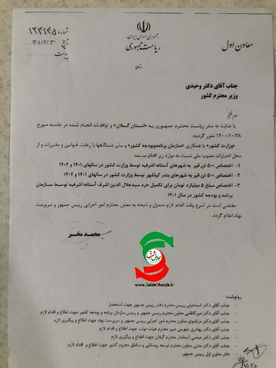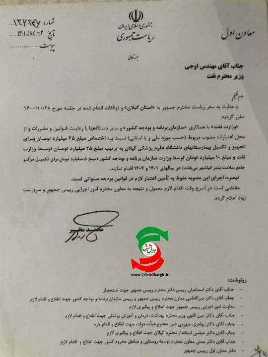 به گزارش پایگاه اطلاعرسانی جلال شرق، ابراهیم نجفی بابیان این خبر به خبرنگار جلال شرق اظهار کرد: با توجه به سفر رئیسجمهور به استان گیلان و توافقات انجامشده در ۲۸ فروردین ۱۴۰۰ و اختصاص ۳۵ میلیارد تومان از محل اعتبارات وزارت نفت (۲۵ میلیارد) و سازمان برنامه بودجه کشور (۱۰ میلیارد) تومان برای تجهیز و تکمیل بیمارستانهای دانشگاه علوم پزشکی گیلان، مبلغ ۵ میلیارد تومان اختصاصاً برای تکمیل جامع سلامت بندر کیاشهر در سالهای ۱۴۰۱ و ۱۴۰۲ در نظر گرفته شد که طی بخشنامهای به وزیر محترم نفت ابلاغ تا در اسرع وقت اقدام شود.