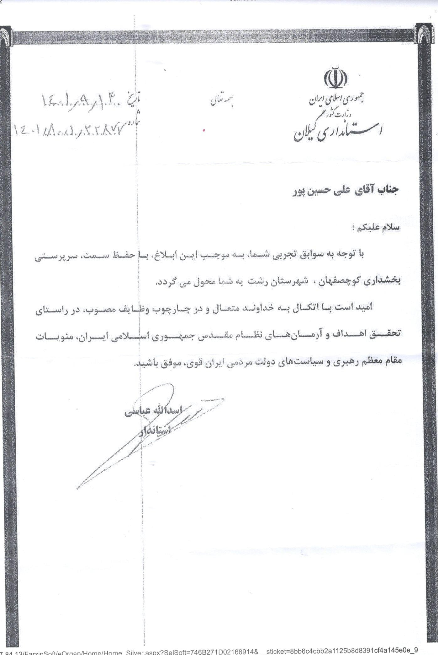 در حکم استانداری استان گیلان خطاب علی حسین پور آمده است : با توجه به سوابق تجربی شما به موجب این ابلاغ باحفظ سمت ، سرپرستی بخشداری کوچصفهان شهرستان رشت به شما محول می گردد امید است با اتکال به خداوند متعال و در چارچوب وظایف مصوب ، در راستای تحقق اهداف و آرمان های نظام مقدس جمهوری اسلامی ایران ، منویات مقام معظم رهبری و سیاست های دولت مردمی ایران قوی ، موفق باشید.