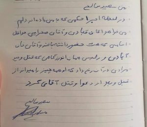 او در ادامه متنی را به عنوان وصیت نامه اش در دفترچه یادداشتم نوشت و تقاضای حضور برخی مسئولان زندان را کرد که در سالهای حبس با آنها ارتباط خوبی پیدا کرده است.