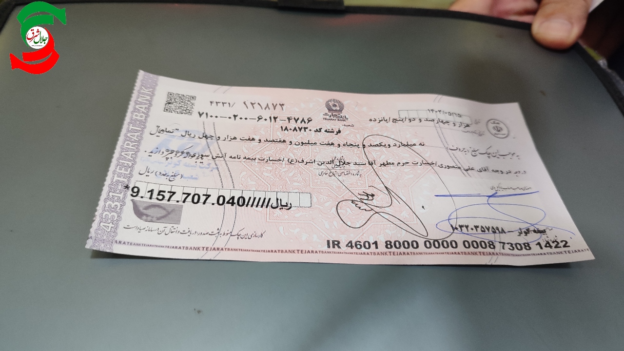 به گزارش جلال شرق ، طی نشستی که پیش از ظهر امروز با حضور ستار علیزاده مدیر کل اوقاف و امور خیریه استان گیلان و رضا محزون سرپرست بیمه کوثر استان گیلان در حسینیه اعظم حرم مطهر برگزارشد یک فقره چک به مبلغ ۹ میلیارد و ۱۴۵۷ میلیون و ۷۰۷هزار و ۴۰ ریال به مدیر کل اوقاف و امور خیریه داده شد .