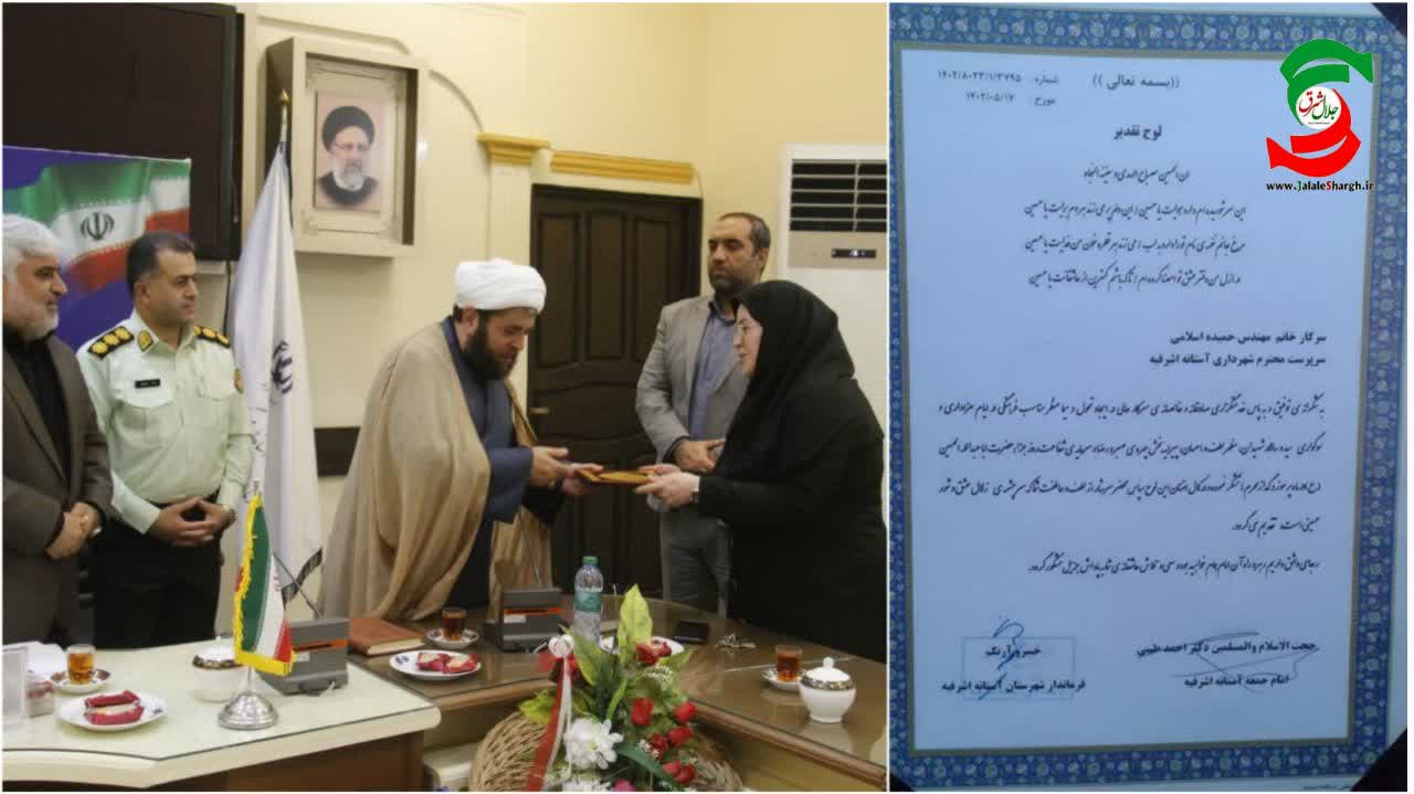 لازم به ذکر است که به پاس فضاسازی شهری ویژه محرم و صفر با اهدای لوح تقدیر از حمیده اسلامی؛ سرپرست شهرداری آستانه اشرفیه تقدیر و تشکر شد.