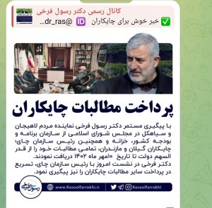 پس از انتشار مصاحبه حبیب جهانساز رئیس سازمان چای کشور که ظهر امروز در حاشیه بازدید از کارخانجات چای شهر لاهیجان و در جمع خبرنگاران که پرداخت ۸۰ میلیارد تومانی دولت به چایکاران را اعلام کرد از آن جایی که نماینگان مردم در مجلس زودتر از دیگر بخش های جامعه از پرداخت حق السهم دولت به چایکاران در جریان قرار می گیرند هریک از این عزیزان از جمله ابراهیم نجفی نماینده استانه اشرفیه ، رسول فرخی نماینده شهرهای لاهیجان ، حجت الاسلام محمد صفری نماینده رودسر ، پرویز محمد نژاد نماینده لنگرود و کاظم دلخوش اباتری نماینده صومعه سرا در کانال های رسمی خود مدعی شدند که با تلاش های فردی آنان این پول به چایکاران پرداخت شده است و شاید بعضی از این آقایان می خواستند با مصادره کردن این خبر در پرداخت های دولت، آن چه در فضای مجازی از حضور کمرنگ آنان درتصویب برنامه توسعه هفتم مجلس انتشار یافته است به بوته فراموشی بسپارند.