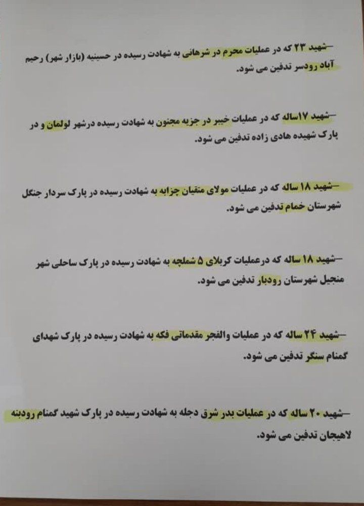 مدیر کل بنیاد حفظ آثار و نشر ارزشهای دفاع مقدس استان گیلان از تشییع و تدفین ۶ شهید دفاع مقدس همزمان با سالروز شهادت حضرت فاطمه زهرا سلام الله علیها گفت و تصریح کرد:استان گیلان با ۵۶ یادمان شهدای گمنام به تعداد ۱۴۶ شهید گمنام در آنجا تدفین می باشد.