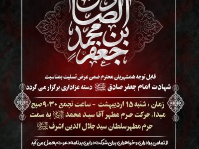 وی با بیان اینکه مراسم دسته عزاداری با حضور طلاب و روحانیون و مردم متدین شهر آستانه اشرفیه در روز شنبه ۱۵ اردیبهشت سالروز شهادت امام صادق علیه السلام ساعت۳۰ /۱۰ صبح از حرم مطهر سید محمد آخوند مزار بطرف حرم مطهر سید جلالالدین اشرف (ع ) راه اندازی خواهد شد افزود: عزاداران آنگاه در مراسم بزرگداشت علمای فقید و شهدای روحانی شهرستان آستانه اشرفیه و سالروز شهادت امام جعفر صادق علیه السلام حرم مطهر به عزاداری و روضه خوانی و مداحی خواهند پرداخت و به سخنان آیت الله رمضانی دبیر مجمع جهانی اهل بیت و عضو خبرگان رهبری گوش فرا خواهند داد.