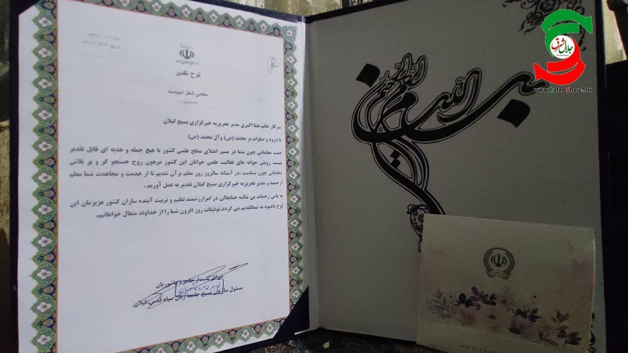 مسئول بسیج جامعه زنان سپاه قدس گیلان به مناسبت گرامیداشت روز معلم از بانوی بسیجی خبرنگار معلم خبرگزاری بسیج گیلان و سردبیر پایگاه خبری جلال شرق تجلیل کرد.