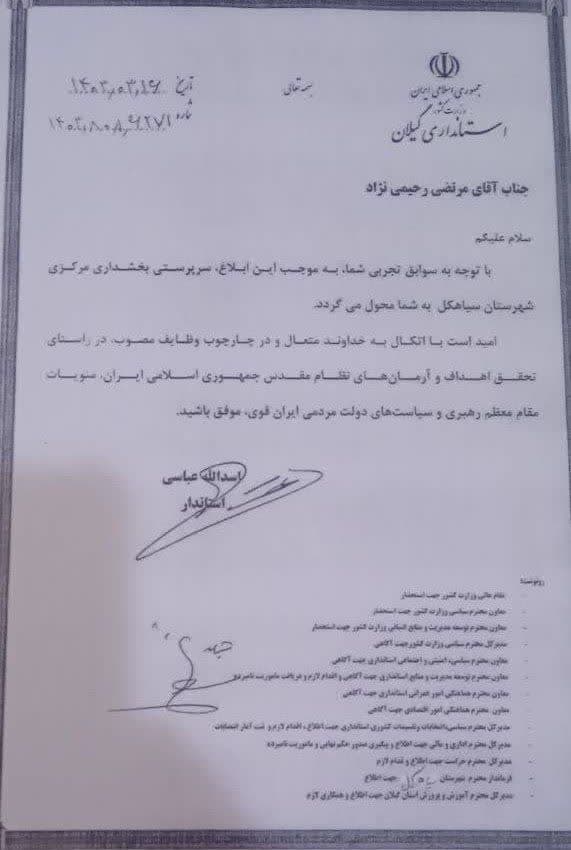 به گزارش پایگاه اطلاعرسانی جلال شرق؛در حکم صادره از سوی اسدالله عباسی آمده است،با توجه به سوابق تجربی شما به موجب این حکم به سمت سرپرست بخشداری مرکزی شهرستان سیاهکل منصوب می شوید.