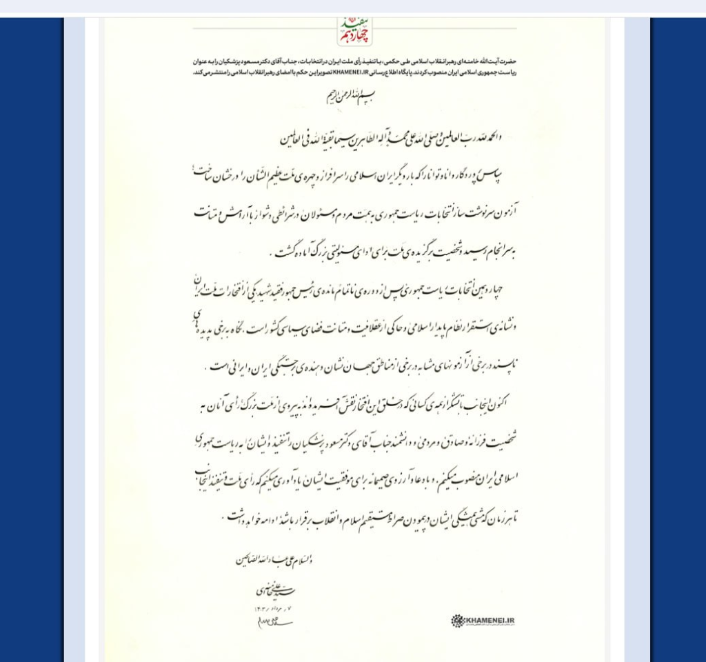 حضرت آیتالله خامنهای رهبر معظم انقلاب اسلامی طی حکمی، با تنفیذ رأی ملت ایران در انتخابات، مسعود پزشکیان را به عنوان ریاست جمهوری اسلامی ایران منصوب کردند.