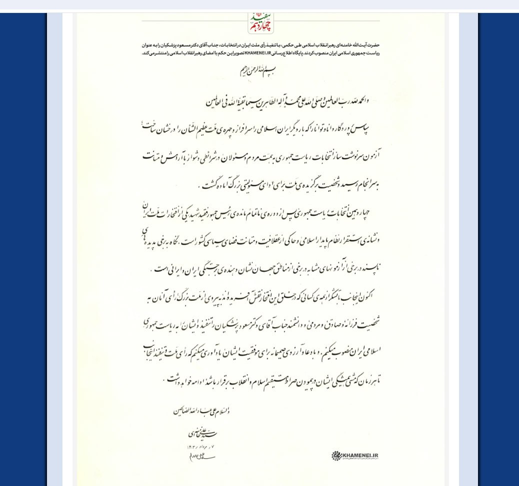 خلق این افتخار نقش آفریدهاند، به پیروی از ملت بزرگ، رأی آنان به شخصیت فرزانه، و صادق، و مردمی، و دانشمند جناب آقای دکتر مسعود پزشکیان را تنفیذ و ایشان را به ریاست جمهوری اسلامی ایران منصوب میکنم. و با دعا و آرزوی صمیمانه برای موفقیت ایشان، یادآوری میکنم که رأی ملت و تنفیذ اینجانب تا هر زمان که مشی همیشگی ایشان در پیمودن صراط مستقیم اسلام و انقلاب برقرار باشد، ادامه خواهد داشت. والسلام علی عبادالله الصالحین سید علی خامنهای ۷/مرداد/۱۴۰۳