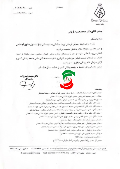 طی حکمی از سوی دکتر محمد رئیس زاده رئیس کل سازمان نظام پزشکی جمهوری اسلامی ایران، دکتر محمد حسین قربانی به عنوان معاون اجتماعی و امور مجلس سازمان نظام پزشکی منصوب شد.