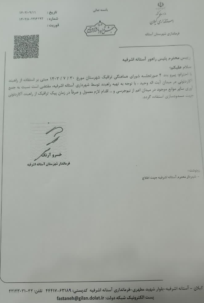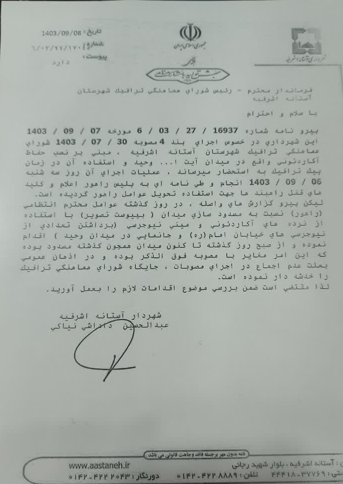 و هیچ توجهی هم به نامه فرماندار و رئیس شورای ترافیک شهرستان به شماره ۱۴۰۳/۸۰۲۳/۶۱۹۲ مورخ ۱۴۰۳/۰۹/۱۱نکرده است که تاکید شده است در زمان پیک ترافیک از موانع آکاردیونی برای مسدود شدن استفاده شود.