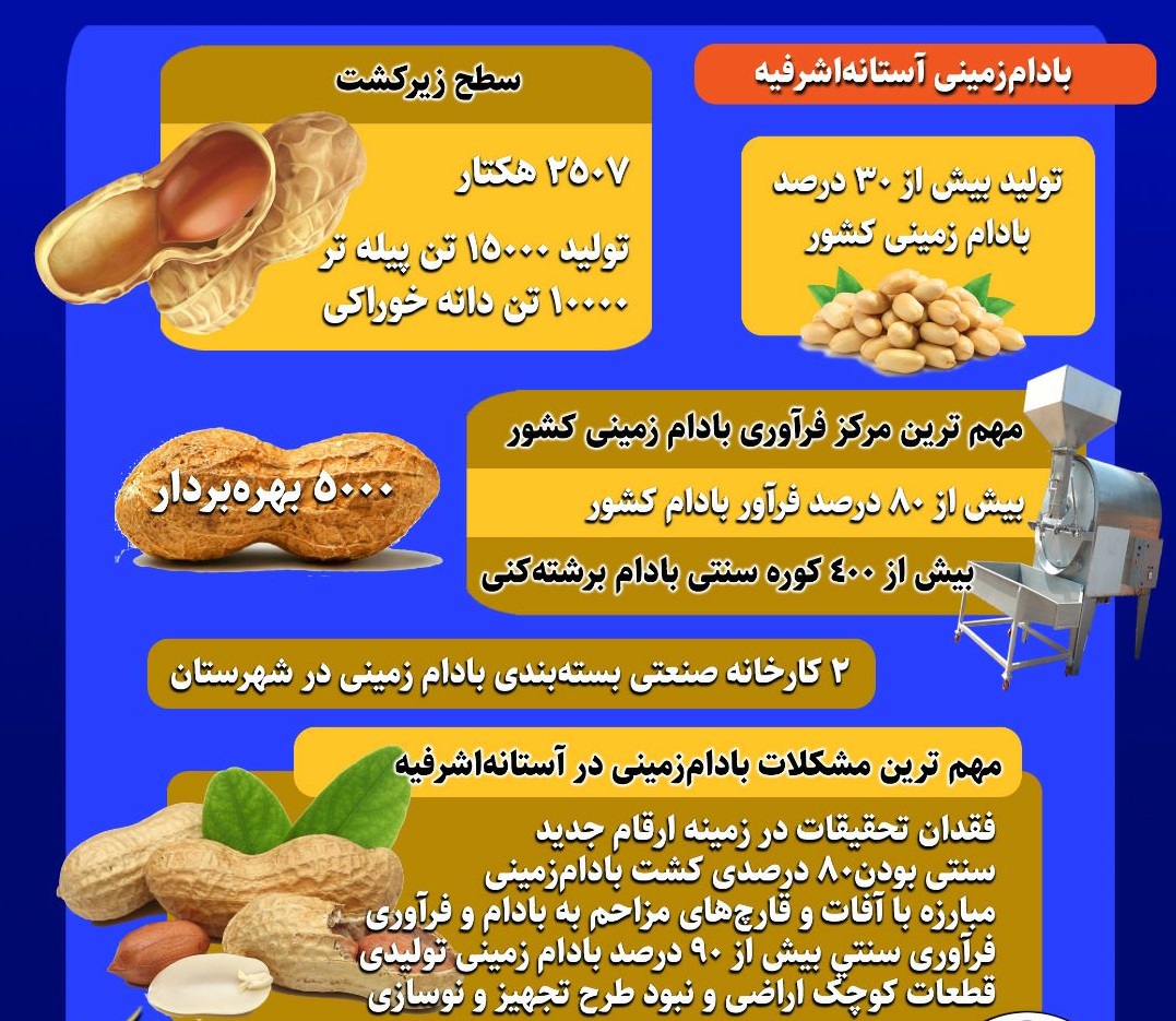 شهرستان آستانه اشرفیه بعد از محصول استراتژیک برنج که مرغوب ترین و با کیفیت ترین برنج دنیاست و در این شهرستان تولید می شود یکی از محصولات کشاوری مهم دیگر این شهرستان بادام زمینی است که طرفداران زیادی در کشور دارد.