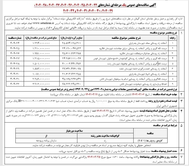 | اداره کل راهداری و حمل و نقل جادهای استان گیلان در نظر دارد، مناقصههای شرح زیر را از طریق سامانه “تدارکات الکترونیکی دولت (ستاد)” برگزار نماید. با توجه به اینکه کلیه مراحل برگزاری مناقصه، از مرحله دریافت و تحویل اسناد مناقصه تا بازگشایی پیشنهادها از طریق درگاه سامانه تدارکات الکترونیکی دولت (ستاد) به آدرس www.setadiran.ir انجام خواهد شد، لذا ضروری است مناقصه گران محترم در صورت عدم عضویت در سامانه، ابتدا نسبت به انجام مراحل ثبت نام در سایت و دریافت «گواهی امضای الکترونیکی» اقدام و سپس در مناقصه شرکت نمایند. |