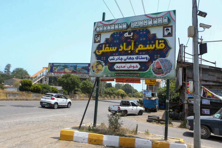 عکاس ایرنا، مراحل چلهکشی را رها نمیکرد و گرما امان میبرید؛ خانه خلافیت و نوآوری آخرین جایی بود که پس از گذر از دیوارنگارههای بسیار و کوچه باغهای پر هیاهو باید میرفتیم؛ پس از گم شدن در کوچه باغهای قاسم آباد سفلی و سبقت از دوج ها (ماشینهای جنگ جهانی دوم که درارتفاعات شرق گیلان میتوان دید) بالاخره تابلوی راهنما را دیدیم و پیچیدیم؛ اینجا از همه جا پر رونقتر بود طرح چادرشب بر دیوارها، کارگاهی فراخ با فروشگاهی وسیع و چادرشبی کهن با نام زن و مرد که زندگی یک خانواده روستایی را نقش کرده بودند.